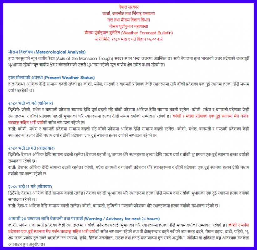 २०८० भदौ १० गते आइतबार दिउँसो देशभर आंशिक देखि सामान्य बदली रही पहाडी भू-भागका थोरै स्थानहरुमा हल्का देखि मध्यम वर्षा र बाँकी भुभागका एक दुई स्थानमा हल्का वर्षाको सम्भावना रहेको र राती देशभर आंशिक देखि सामान्य बदली रहने विभागले जनाएकाे छ। विभागका अनुसार कोशी, मधेश बागमती र गण्डकी प्रदेशका थोरै स्थानहरूमा र बाँकी प्रदेशका एक-दुई स्थानमा हल्का देखि मध्यम वर्षाको सम्भावना रहेको छ।