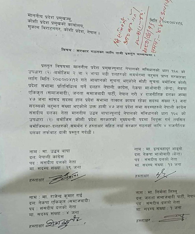 प्रदेश प्रमुख परशुराम खापुङले मंगलबार साँझ ५ बजेसम्म मुख्यमन्त्रीमा दाबी पेश गर्न आह्वान गरे अनुसार गठबन्धनले बहुमत जुटाउन सभामुख गाैतमलाइ राजीनामा दिन लगाएकाे हाे । बहुमत पुगेका कारण थापााप मुख्यमन्त्री बन्ने छन् । यसअघि सभामुखकाे समेत समर्थनमा थापा मुख्यमन्त्री बनेकामा सरकार गठनमा सभामुखकाे हस्ताक्षर कानुन विपरित भएकाे भन्दै सर्वाेच्चले थापाकाे नियुक्ति बदर गरिदिएकाे थियाे ।