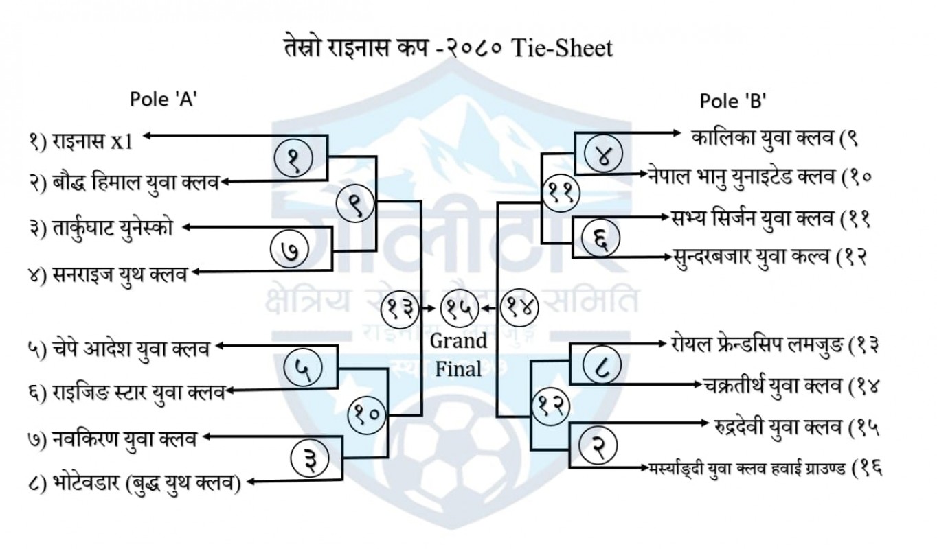 प्रतियाेगितामा समूह कबाट राइनास ११ बाैद्ध हिमाल युवा क्लव, तार्कुघाट युनेस्काे, सनराइज युथ क्लव, चेपे आदेश युवा क्लव, राइजिङ स्टार युवा क्लव, नविकरण युवा क्लव र बुद्ध युथ क्लव भाेटेओडार खेल्नेछन् ।