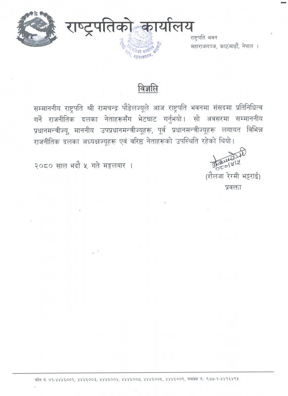 बैठकका क्रममा राष्ट्रपति पौडेलसमक्ष दलका नेताहरूले संसद्को अवरोध खोल्नेदेखि देशको आर्थिक स्थितिलगायतका समसामयिक विषयमा धारणा राखेका थिए। बैठकमा राष्ट्रपतिले आफूलाई नेपालको संविधान र प्रणालीप्रति नै खेलबाड हुन खोजेको हो कि भन्ने आभास हुन थालेको धारणा व्यक्त गरेका थिए। राष्ट्रपतिले जनताका यावत् समस्याहरूको समाधान गर्ने सार्वभौम थलो संसद् लामो समयदेखि अवरुद्ध हुँदा जनताका आवाज मुखरित हुने काम बन्द हुने भएकाले दललहरुको आपसी संवाद र प्रयत्नले सहमतिको नजिक पुगेको भन्ने खबरबाट सन्तोष मिलेको बताएका थिए ।