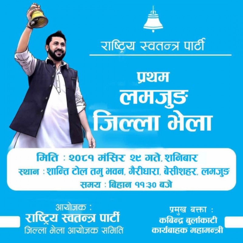 बेसीशहर, मंसिर २४ गते । देशभर जिल्ला भेलामा जुटेको देशको चौथो ठूलो दल राष्ट्रिय स्वतन्त्र पार्टीे (रास्वपा)ले लमजुङमा पनि जिल्ला भेला गर्ने भएको छ ।