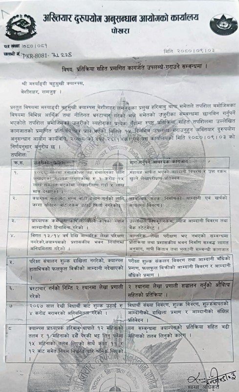 अख्तियार दुरुपयोग अनुसन्धान आयोगको पोखरा कार्यालयले क्याम्पसमा पठाएको पत्रमा स्नातकोत्तर तह संचालनका लागि लगाइएको महायज्ञ मार्फत भएको आम्दानी विवरण र उक्त रकम खुल्ने लेखापरिक्षण प्रतिवेदन, आन्तरिक लेखा परिक्षण भए नभएको सम्बन्धमा स्पष्ट प्रतिक्रियासँगै प्रशासकीय भवन निर्माणको लागत अनुमान, नापी किताब तथा भुक्तानी कागजातको प्रमाण, क्याम्पस मूल गेट सम्म सडक निर्माणको आम्दानी खर्चको सत्यतथ्य प्रमाण, प्राध्यापक कर्मचारी कोषको रकम, ब्याज आम्दानी विवरण र बैंक स्टेटमेन्ट सहितको प्रमाण मागेको छ ।