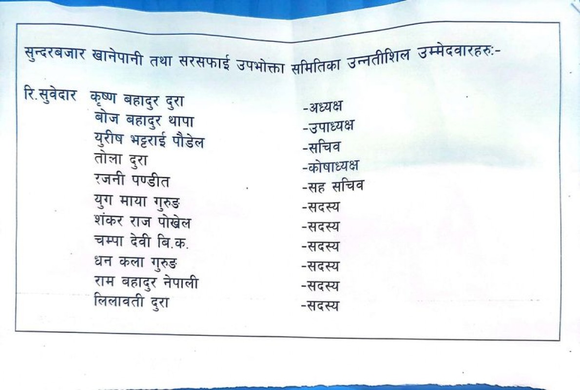 सुन्दरबजार खानेपानी तथा सरसफाइ समितिको नयाँ कार्य समितिको लागि मंगलबार निर्वाचन भएकाे थियाे ।
