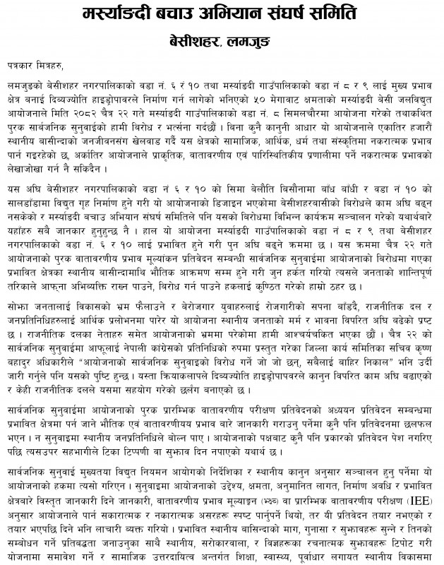 बेसीशहर नगरपालिकाको वडा नं. ६ रं १० तथा मर्स्याङदी गाउँपालिकाको वडा नंं ८ र ९ लाई मुख्य प्रभाव क्षेत्र बनाई दिब्यज्योति हाइड्रोपावरले निर्माण गर्न लागेको भनिएको ५० मेगावाट क्षमताको मर्स्याङदी बेसी जलविद्युत आयोजनाले मिति २०८२ चैत्र २२ गते मर्स्याङदी गाउँपालिकाको वडा नं. ८ सिमलचौरमा आयोजना गरेको पुरक सार्बजनिक सुनुवाई कानुन बिपरित रहेकाे भन्दै संघर्ष समितिले त्यसकाे बिरोध र भर्त्सना गरेको छ । संघर्ष समितिले आयोजनाले कानुन अनुसार गर्नुपर्ने न्यूनतम काम समेत पुरा नगरी सार्वजनिक सुनुवाई गरिएकाले उक्त सुनुवाई मान्य नहुने जनाएको हो ।