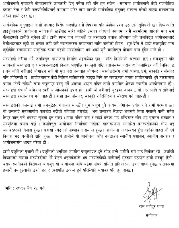 बिज्ञप्तीमा सोझा जनतालाई विकासको भ्रम फैलाउने र बेरोजगार युवाहरुलाई रोजगारीको सपना बाँडदै, राजनीतिक दल र जनप्रतिनिधिहरुलाई आर्थिक प्रलोभनमा पारेर यो आयोजना स्थानीय जनताको मर्म र भावना विपरित अघि बढेको प्रष्ट देखिएको उल्लेख गर्दै संघर्ष समितिकै सहमतिमा आयोजना फरक स्थान र डिजाइनमा कार्यान्वयन गर्न लागिएको भनि प्रचार गरिएकोमा पनि आपत्ती जनाइएको छ । संघर्ष समितिले खुदीदेखि दलालसम्मको क्षेत्रमा प्राकृतिक रुपमा बगेको मर्स्याङदीमा कुनै जलविद्युत आयोजना बन्न नहुने संघर्ष समितिको एकसुत्रीय माग रहँदै आएको पनि प्रेस बिज्ञप्तीमा स्पष्ट पारेको छ ।