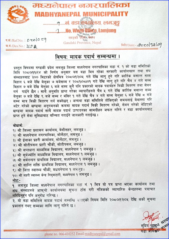 बेसीशहर, चैत्र २ गते । मादक पदार्थकाे सेवनका कारण ब्यक्तिको स्वास्थ्यका साथै समाजमा पर्ने नकरात्मक प्रभाव न्यूनिकरण गर्न लमजुङको मध्यनेपाल नगरपालिका वडा नंं १ को वडा समितिले वडा भित्र रहेका सरकारी कार्यालय तथा संघसंस्थाको तीनसय मिटर वरिपरि निश्चित समय ताेकेर मादक पदार्थ विक्री वितरण र सेवनमा बन्देज लगाएको छ ।