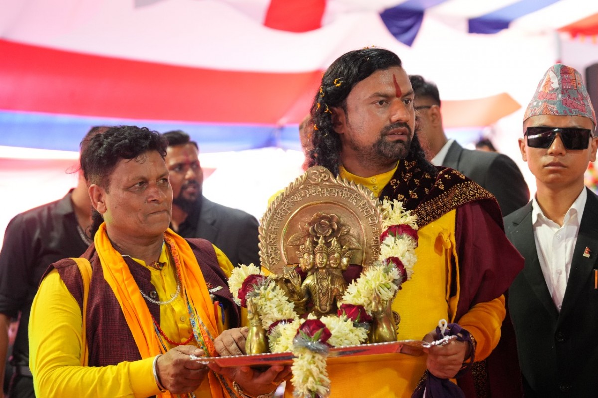 लामो शंखघोष गरेका अधिकारीलाई कोटीहोमका संकल्पकर्ता बालयोगेश्वर विजय कृष्णमूर्ति महाराज र अन्तर्राष्ट्रिय भागवत वाचिका देवी प्रतिभाले सम्मान गरेका थिए ।